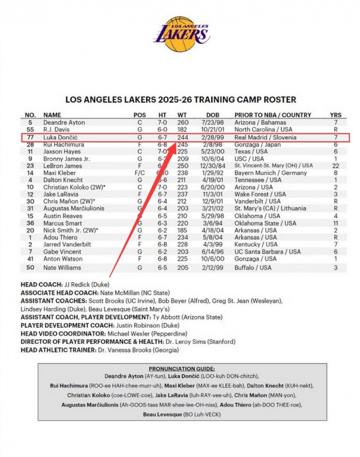 直播吧10月01日讯湖人公布了新赛季训练营名单。