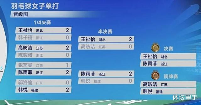 陈雨菲的女单决赛争冠对手将会是世界第2王祉怡,代表湖北队的王祉怡在另外一场半决赛同样以21-12、21-11连胜两局、总局分2-0完胜江苏队选手高昉洁。陈雨菲距离自己的全运会女单三连冠霸业仅一步之遥!