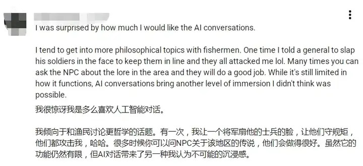 国服上线流行一时的调戏NPC也被老外玩出了花。很多玩家花费数小时与智能NPC聊天,让他们介绍游戏背景与中国文化。经过深度调试的NPC总能将对话限定在游戏的背景框架内,让不少玩家都没有意识到这是AI实时生成的对话。