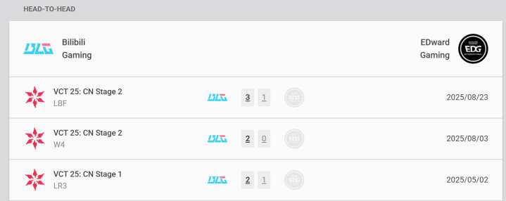 此前双方交手的战绩,一直是EDG以9胜0负遥遥领先。但在2025VCTCN第一赛段季后赛之后,BLG在双方交手记录方面占优,如今BLG来到四连胜。