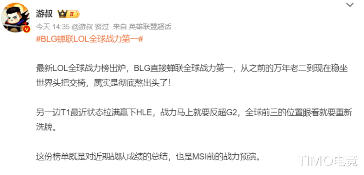 拳头全球战力榜出炉, BLG三连榜首! 网友: lpl最有希望的一年