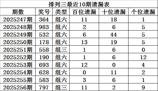 上期回顾:排列三第2025256期奖号:797,组三,直选遗漏总值为22期。