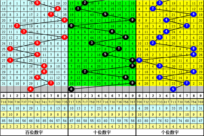 十位:上期为9,近10期012路比为5:1:4,其中0路号遗漏2期出现,本期注意0路号再出,参考0。