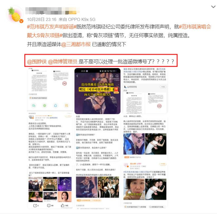 与此同时,有网友认为应该严惩造谣范玮琪在演唱会佩戴大S骨灰项链的一些网络用户。