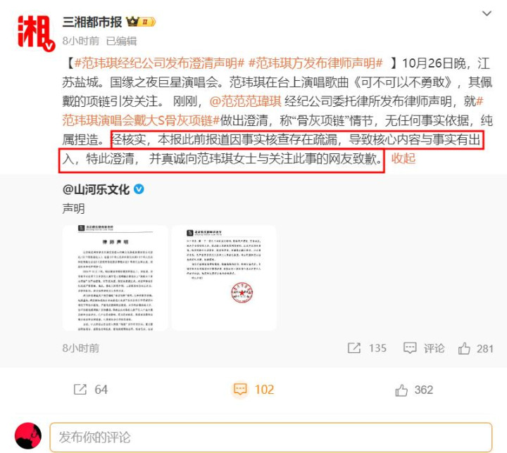 在看到辟谣声明第一时间,《三湘都市报》便发文向范玮琪和关注此事的网友道歉了。