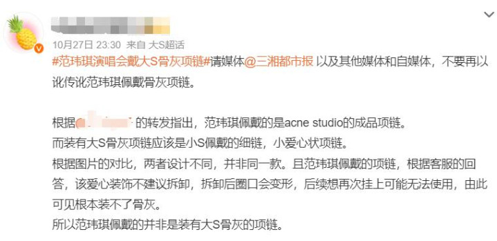《三湘都市报》等媒体在未经核实的情况下,就报道称范玮琪佩戴大S骨灰项链在演唱会上唱歌缅怀大S。