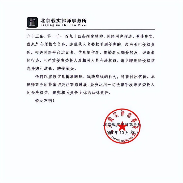 她通过经纪公司发布了一份律师声明回应此事了。