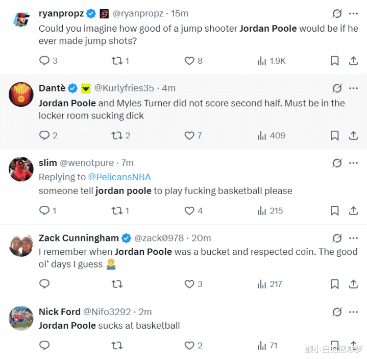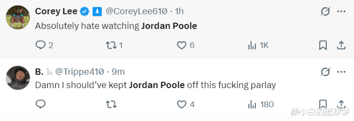 第三节普尔4中0,末节普尔3中1(决胜3分55秒直接被弃用);全场比赛27分钟,14中3,三分6中1,拿到11分2篮板6助攻4犯规3失误,命中率21.4%,三分命中率16.7%。看看美国球迷是如何狂喷普尔的吧。