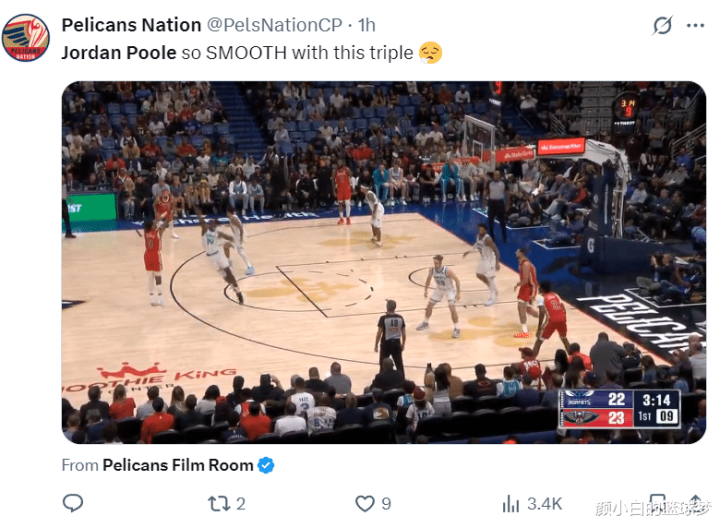 首节还剩3分14秒的这个撤步三分球是这场比赛普尔最出色的一球,因为一场比赛他也没几次运动战得分,他今夏被鹈鹕交易来后主要的作用还是喜剧人。