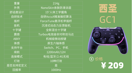 硬件配置方面,西圣GC1同样表现出色。它搭载电竞级极速连接引擎,支持2.4G、蓝牙和Type-C三模,输入延迟低至0.5ms,保证操作精准与稳定;原生六轴体感传感器实现1ms低延迟动作映射,射击、漂移更沉浸;214g轻量化机身、15°握角与NanoSkin亲肤防滑涂层带来舒适握感;半透明幻雾晶透机身配10种RGB灯效,科技感与沉浸感兼具;设备兼容全面,手机、PC、Switch等全平台畅玩。整体配置在百元价位中极为罕见,性价比十足。