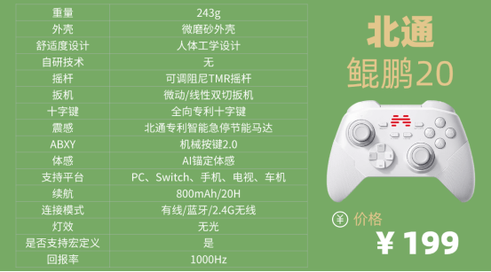 震动方面支持AI场景自适应,细节表现比同价位产品更足;十字键段落感自然,方向触发易上手。连接方式覆盖有线、蓝牙5.3与2.4G,三模切换顺畅,兼容PC、Switch、手机、电视和车机等多个平台。续航为20小时,同时支持边玩边充基本不会影响体验。