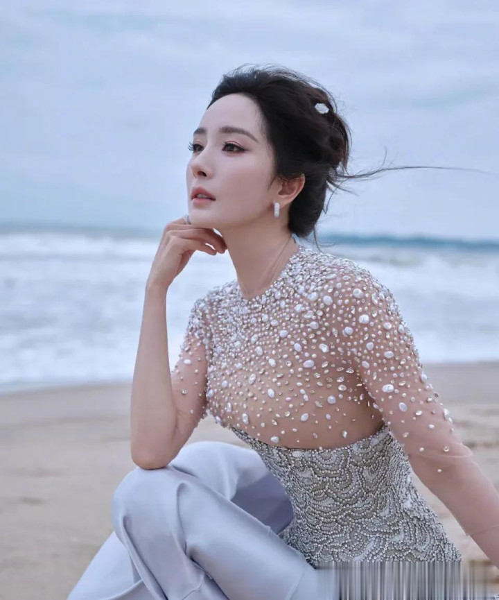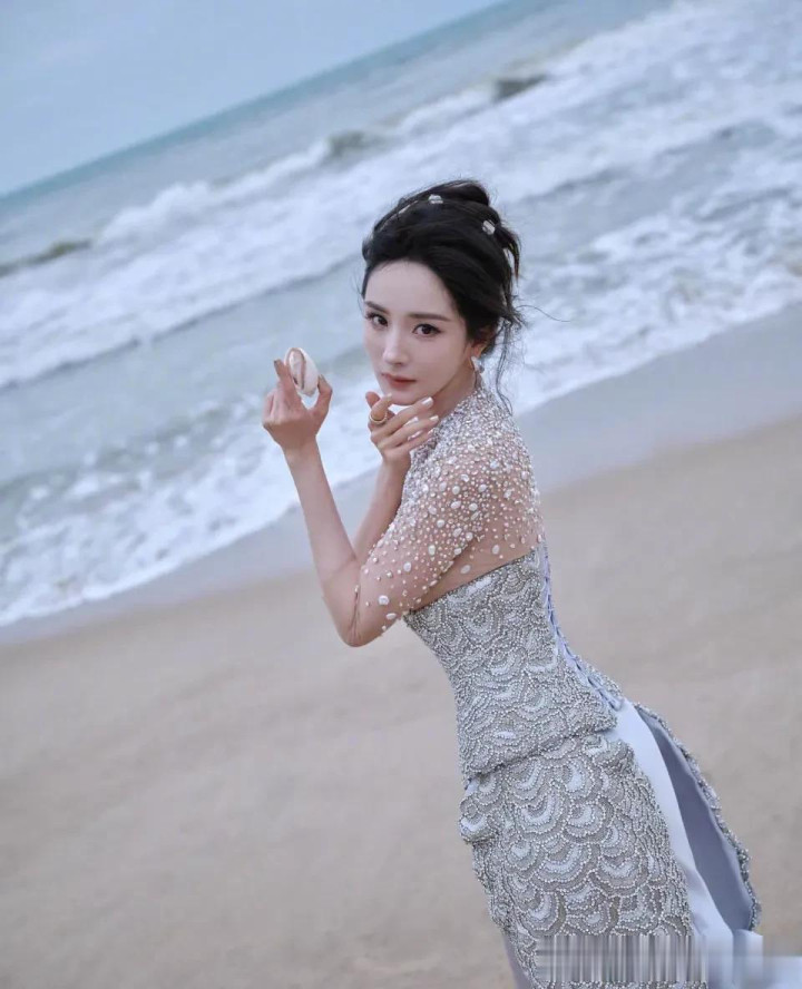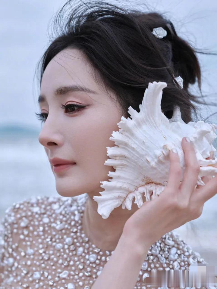 杨幂拿起了贝壳,放在耳边聆听大海的声音,工作室给她拍下了美美的特写照。