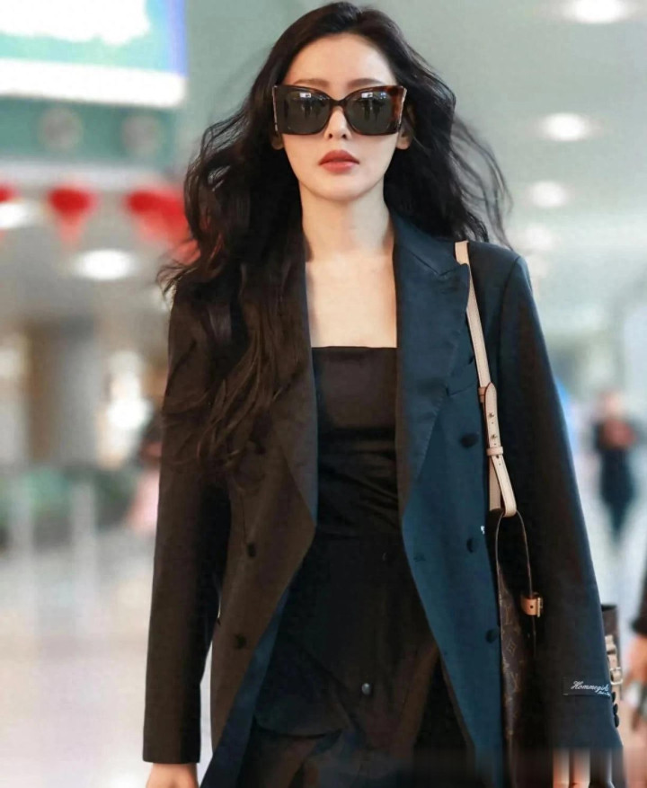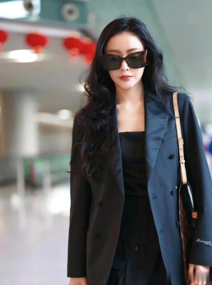 张天爱机场私服才叫简约! 穿黑色西装+抹胸裙, 时髦又高级!