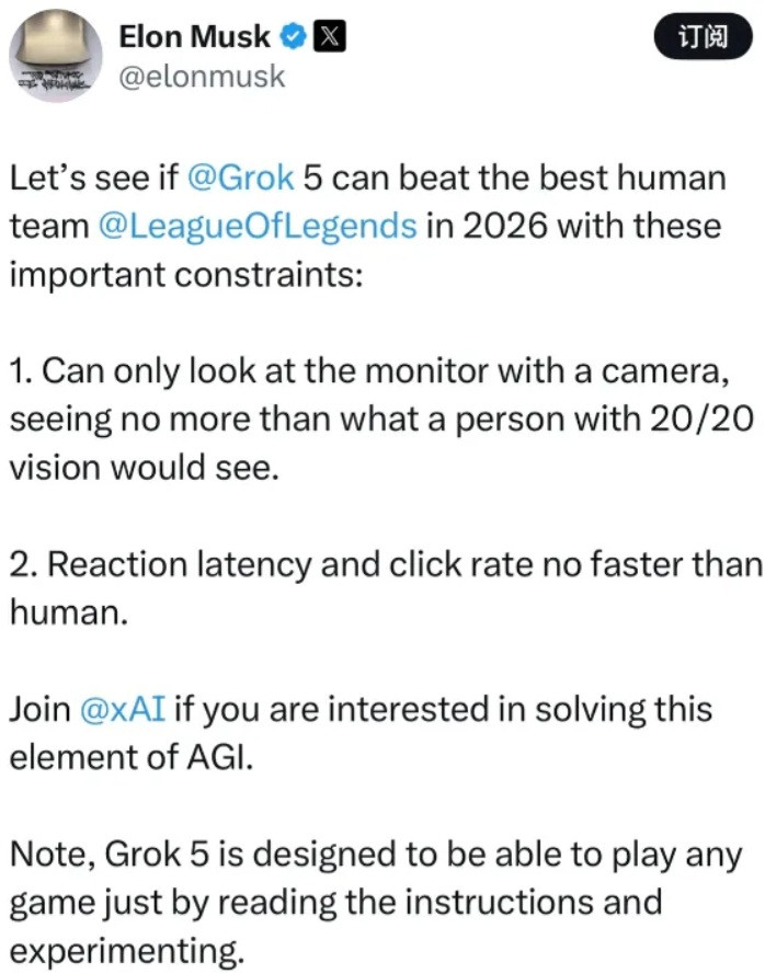 公布这个消息的是美国首富马斯克,他放话要组建英雄联盟AI战队,挑战英雄联盟最强战队T1,而T1也接受了这份挑战,这个消息公布之后马上引起全世界LOL玩家的热烈讨论,结合不同观众对于AI的认知与看法,觉得AI胜出和觉得T1胜出的观众都不少。